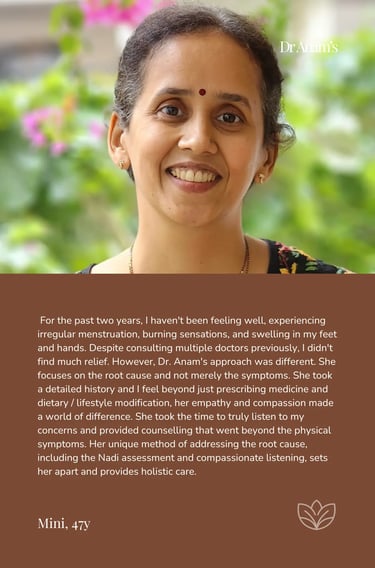 Unlike many doctors who focus on symptomatic relief, in Ayurveda, we focus on addressing the root causes for complete healing.